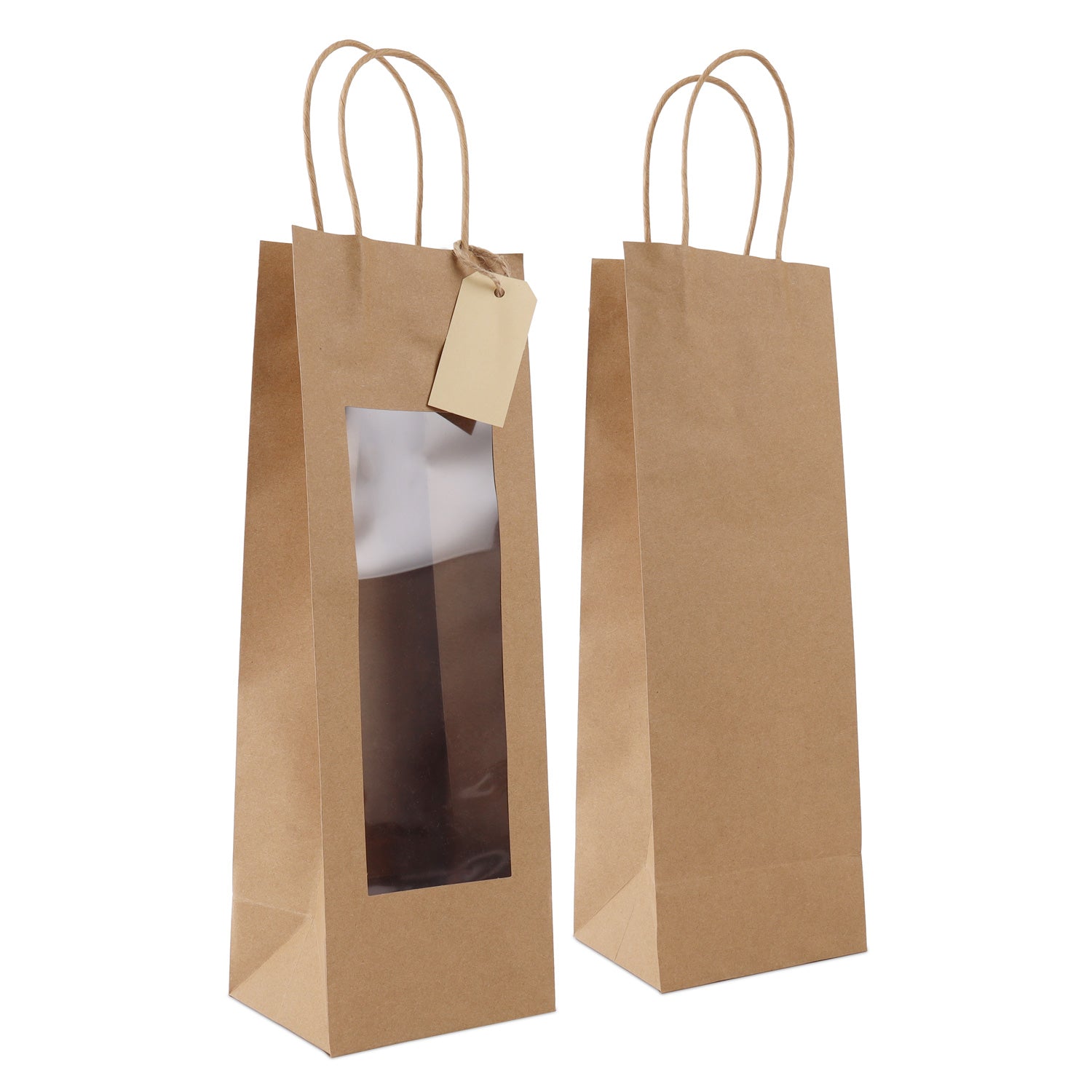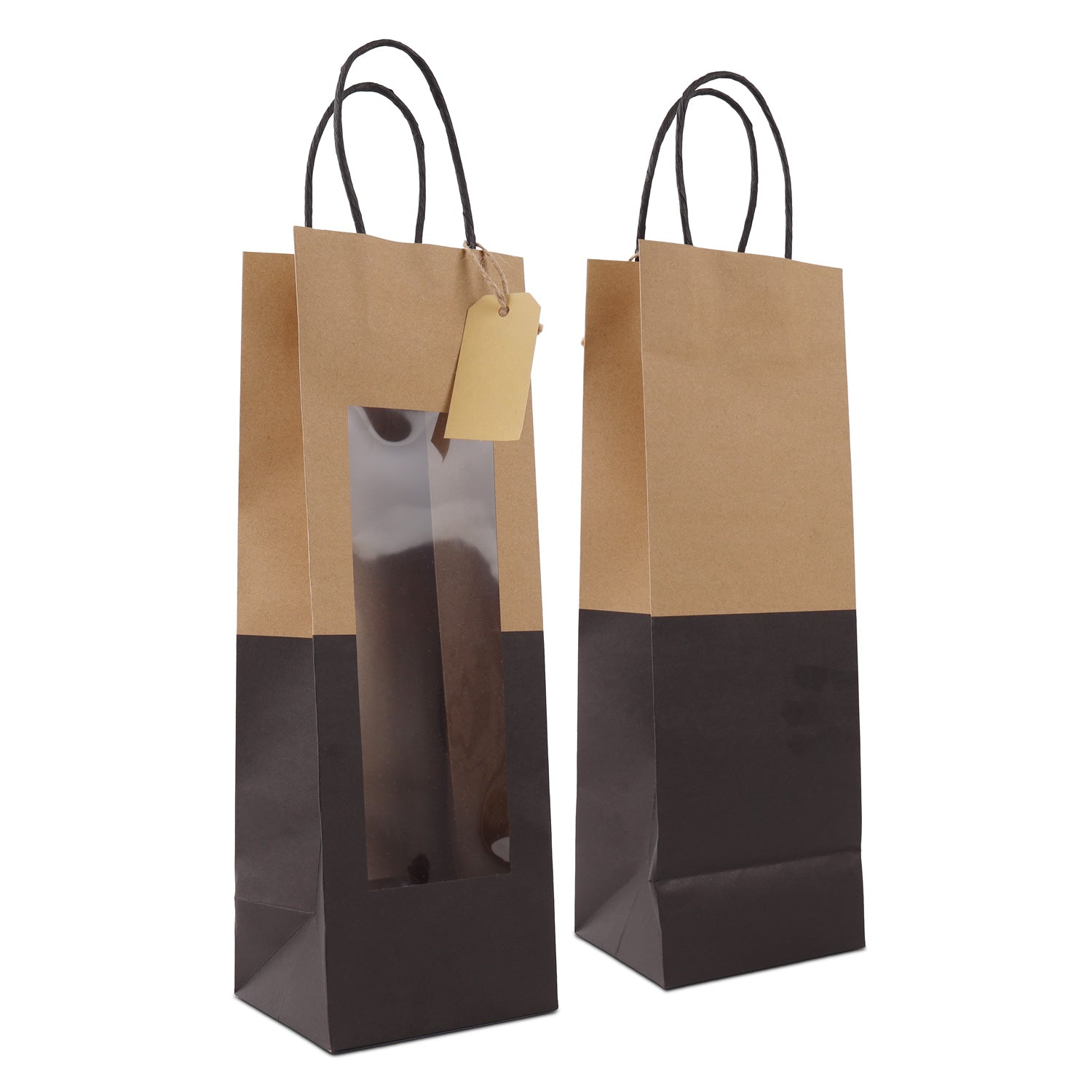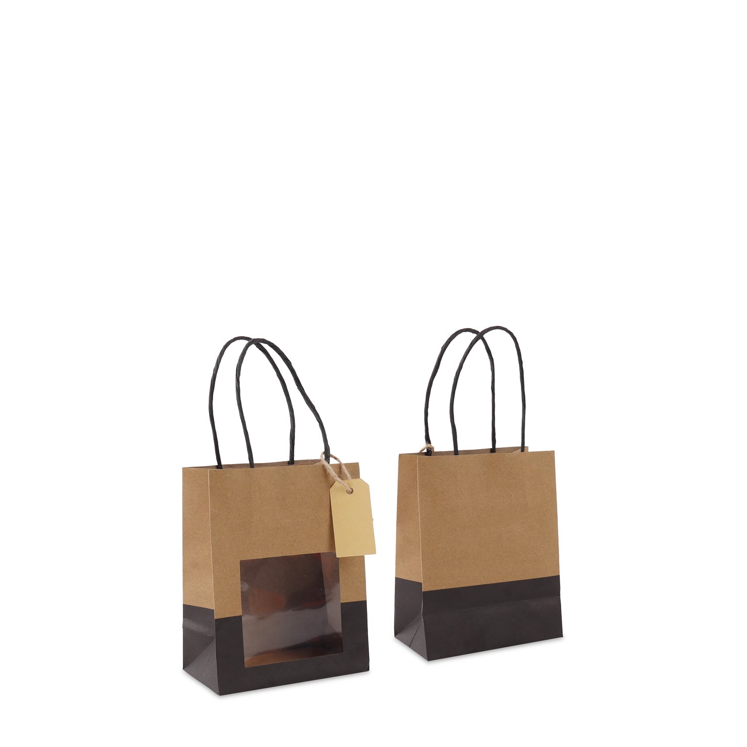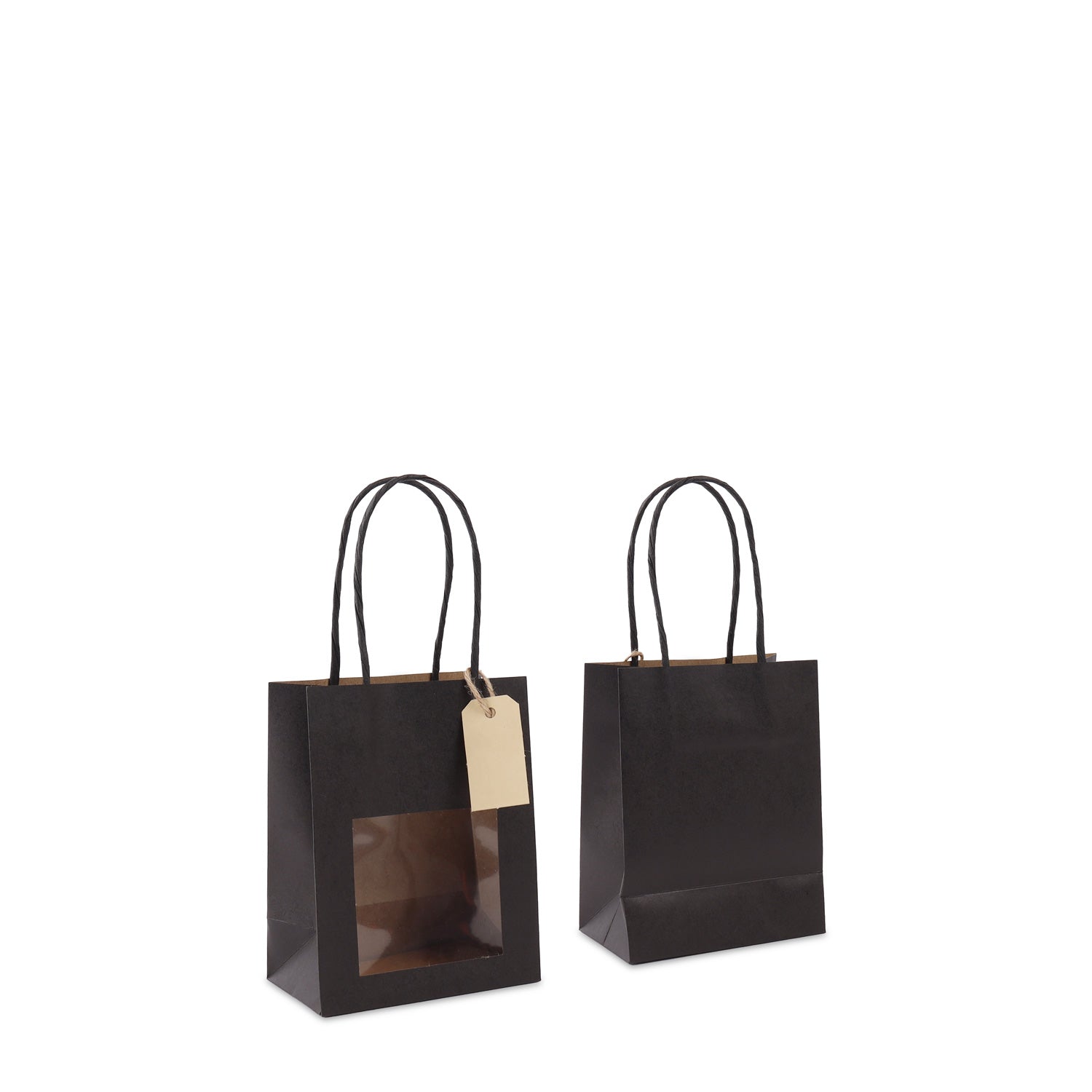Twisted papieren cadeau draagtasjes met een venster en papieren hangtag